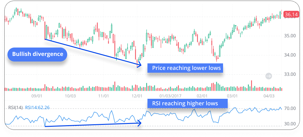 Apabila RSI mencapai aras terendah yang lebih tinggi sementara harga aset lebih rendah daripada aras terendah, pencapahan bulis terbentuk. Ini menunjukkan bahawa walaupun harga masih jatuh, momentum downside telah lemah. Balikan mungkin akan berlaku.