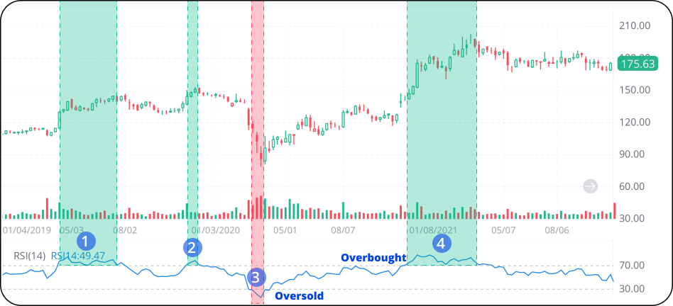 Seperti yang kita nampak di bawah ini, dalam tempoh 1, 2, dan 4, RSI telah mencapai melebihi 70 dan kekal di kawasan terlebih beli, yang menunjukkan bahawa momentum upside adalah kuat. Sehubungan itu, kita boleh nampak peningkatan mendadak dalam carta harga (khususnya dalam tempoh 4). Pelabur mungkin mahu menjual aset pada akhir tempoh terlebih beli itu. Ini disebabkan apabila RSI jatuh balik di bawah 70, momentum upside menjadi lemah, dan balikan boleh berlaku.