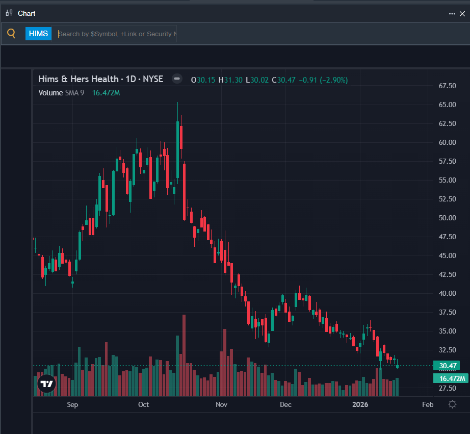 • HIMS Price Action: Shares of Hims & Hers Health fell 2.9% to close at $30.47 on Tuesday.